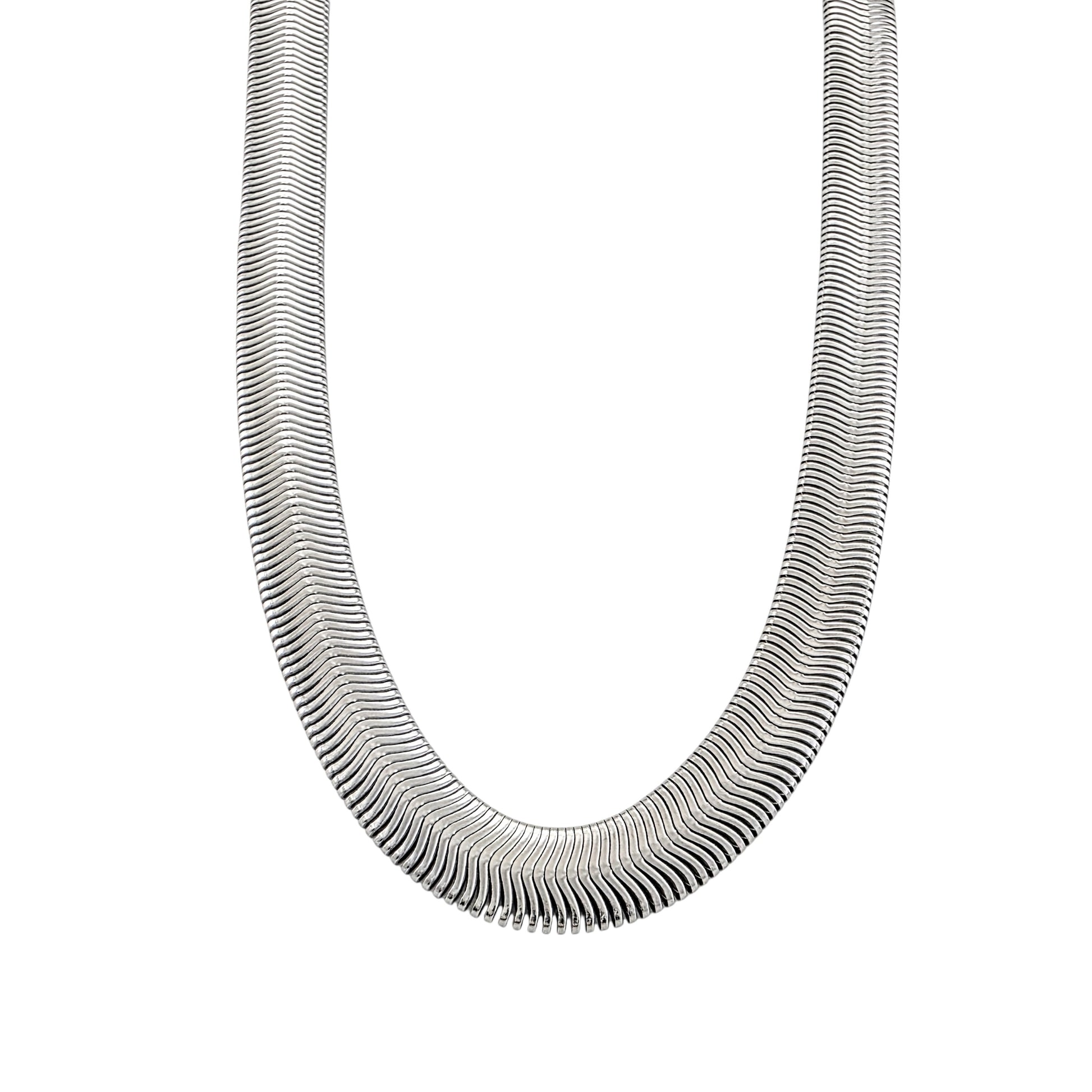 A flat snake chain—wide, smooth, and clinging to the neck like a silver ribbon. At 10mm wide, it's substantial enough to be the centerpiece of your look without needing anything else. Each link is flat and fits perfectly into the next, giving it a fluid, almost liquid feel that's truly stunning.
